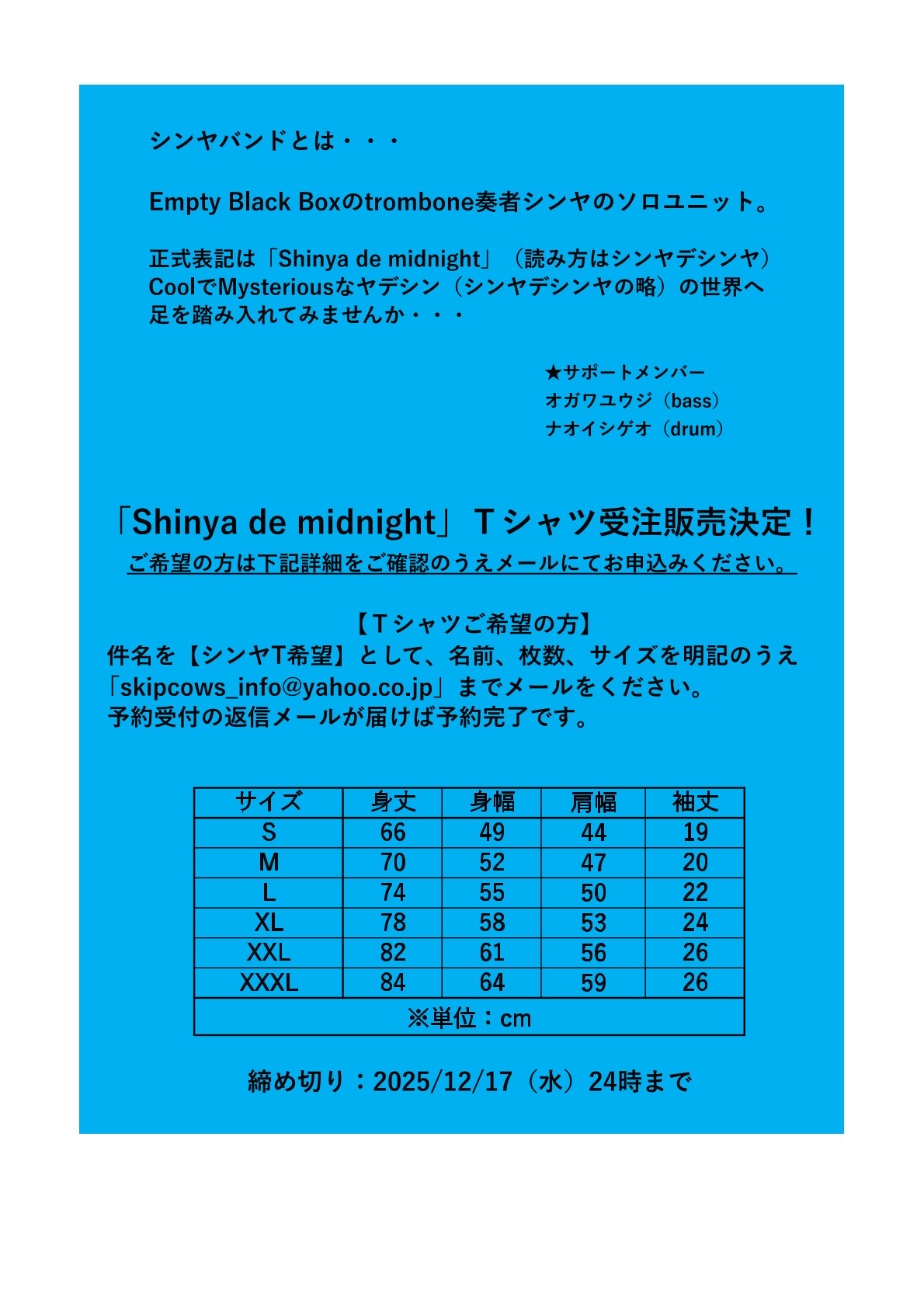 ご希望の方は件名に「シンヤT希望」、本文にお名前、サイズ、枚数を明記の上、skipcows_info@yahoo.co.jpまでメールをお送りください。